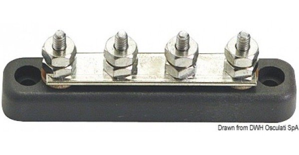 Пластиковое основание с высокими изоляционными свойствами. Шина из никелированной меди, винты и гайки из нержавеющей стали.