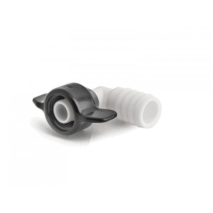 Переходник угловой с резьбового соединения 1/2 на шланг 19мм. Изготовлен из белого АВС-пластика.