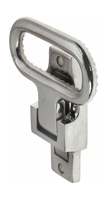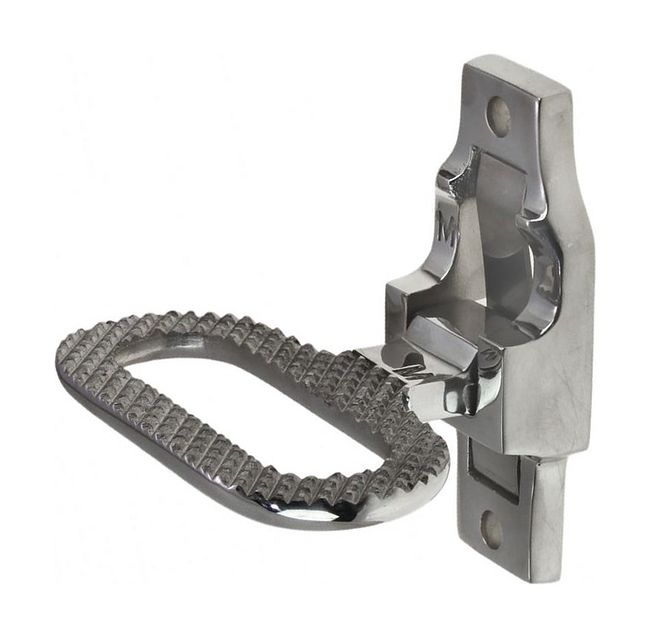 Ступенька удерживается в сложенном состоянии пружинным фиксатором, изготовлена из нержавеющей стали с добавлением молибдена, поэтому отличается устойчивостью к действию солей.