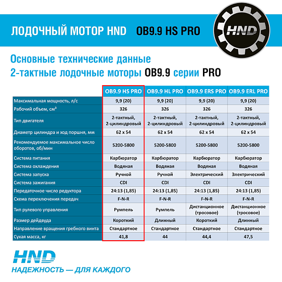 Хотите купить качественный лодочный мотор, который не нужно будет регистрировать в ГИМС? Предлагаем вам современную модель от китайской компании HND, которая много лет выпускает качественные моторы по очень приятной цене. Продукция бренда изготавливается с применением японских и американских технологий на качественном оборудовании. Вместе с мотором также поставляются: топливный шланг с грушей, внешний топливный бак 24 литра, крыльчатка насоса, гребной винт, набор инструментов, инструкция, чека и аварийный шнур.