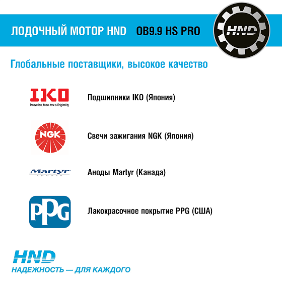 - Лодочные моторы HND имеют великолепную коррозийную стойкость благодаря самым лучшим мировым антикоррозийным технологиям и производственным линиям автоматического электрофореза.