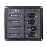 Панель из анодированного алюминия. Тумблеры имеют светодиодную индикацию и водонепроницаемые силиконовые колпачки. Каждая цепь защищена автоматическим предохранителем с аналогичным силиконовым колпачком (два по 15 ампер, три по 10 ампер, один 5 ампер). Размеры: 170х90 мм.