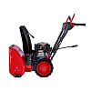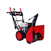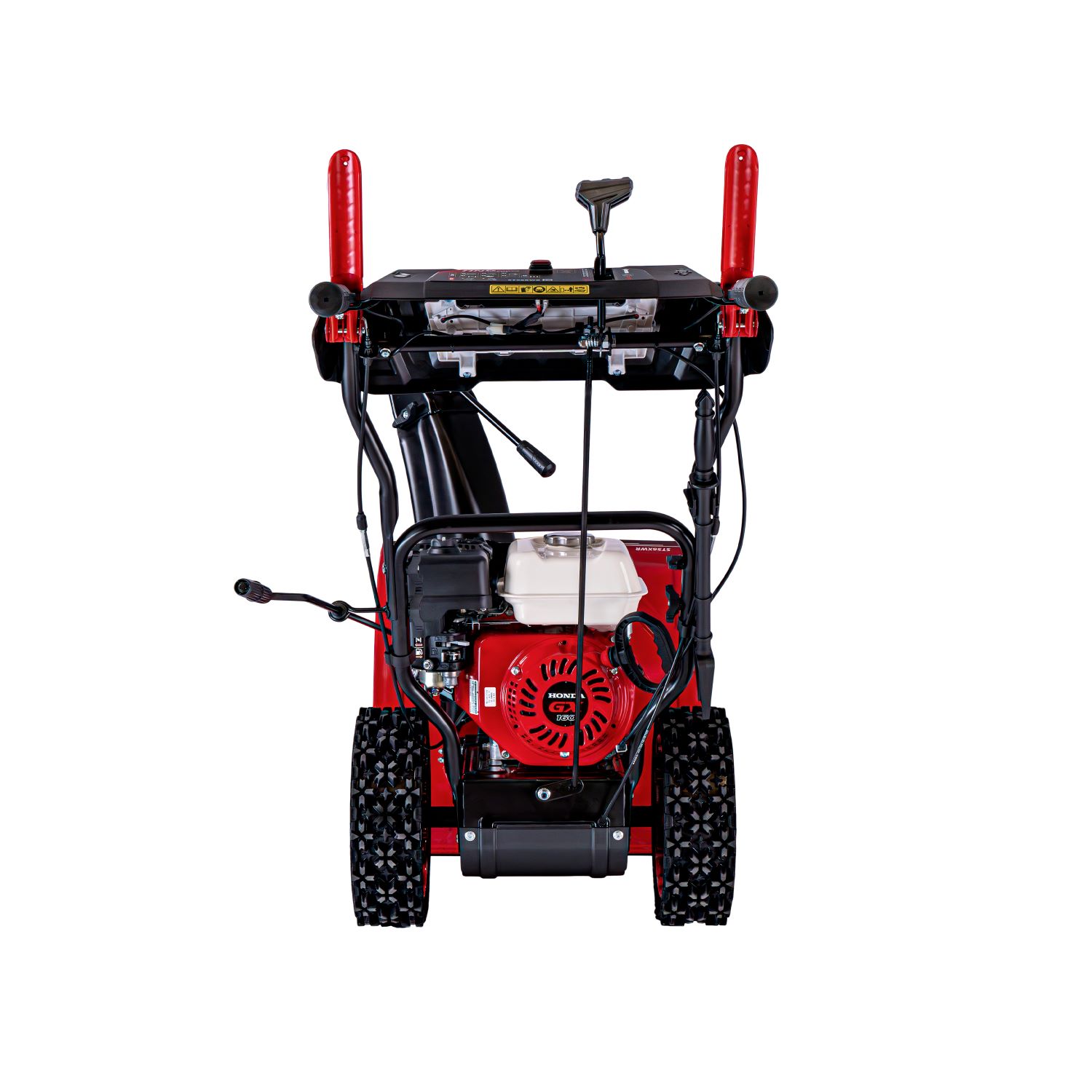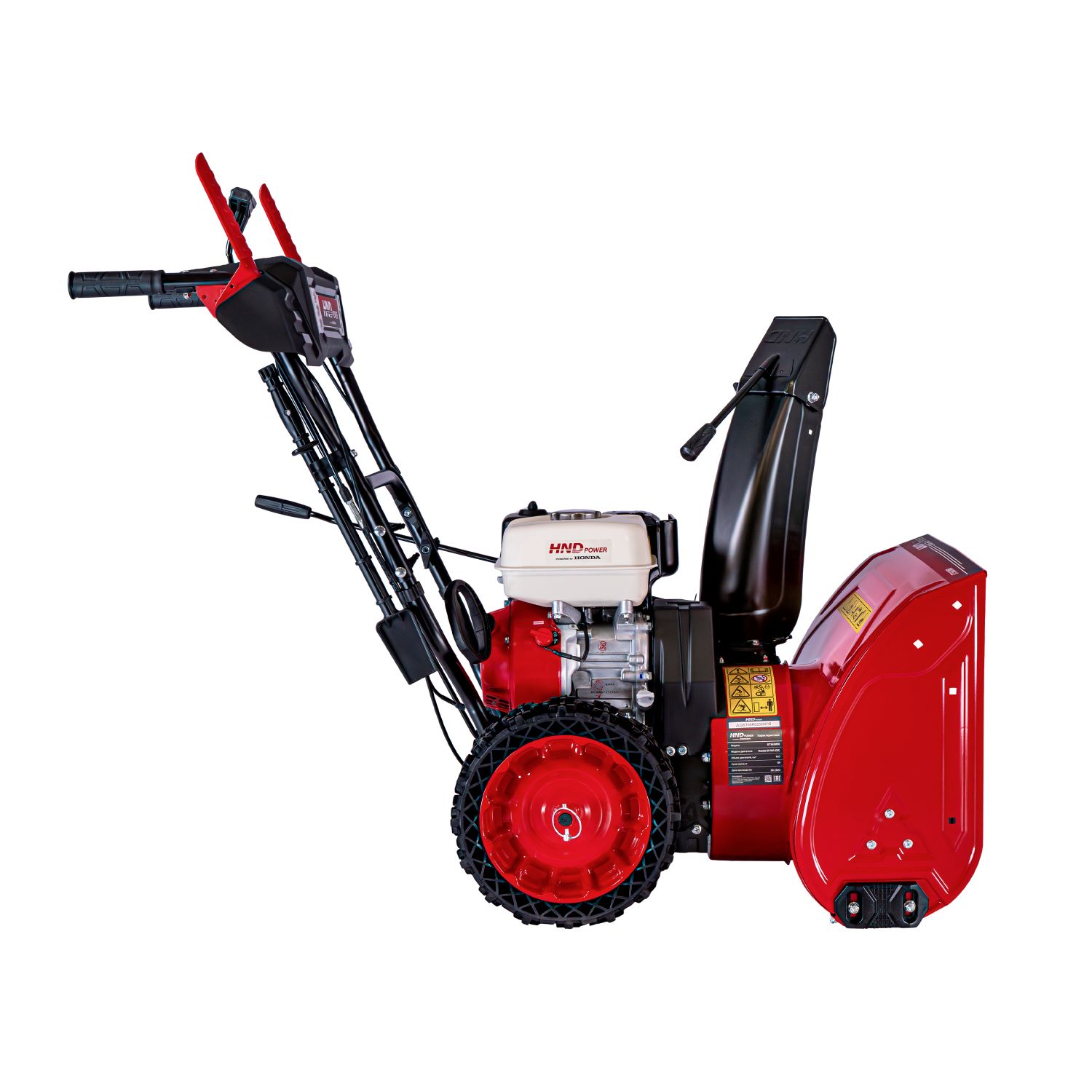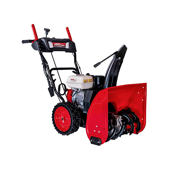 Инженеры компании ХНД установили в этот снегоуборщик мощный бензиновый мотор Honda GX160 рабочим объемом 163 см³. Двигатель позволяет развивать высокую скорость и дает возможность двухступенчатой системе выброса справляться даже с плотным слежавшимся снегом. Стальной скребок ковша также упрощает процесс уборки. Для управления поворотом желоба выброса снега используется боковой рычаг. Для выбора угла выброса снега применяется специальный переключатель на желобе.