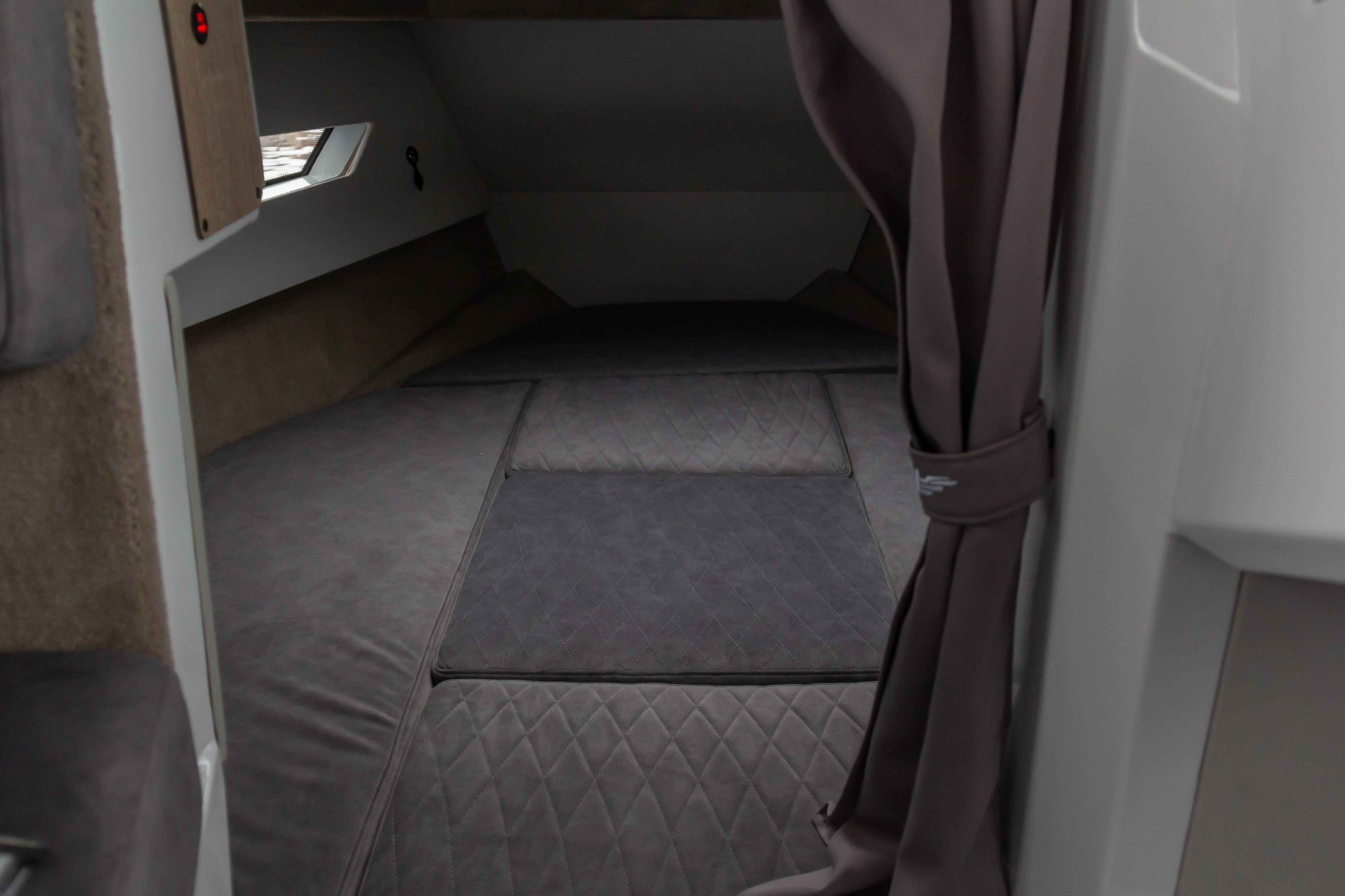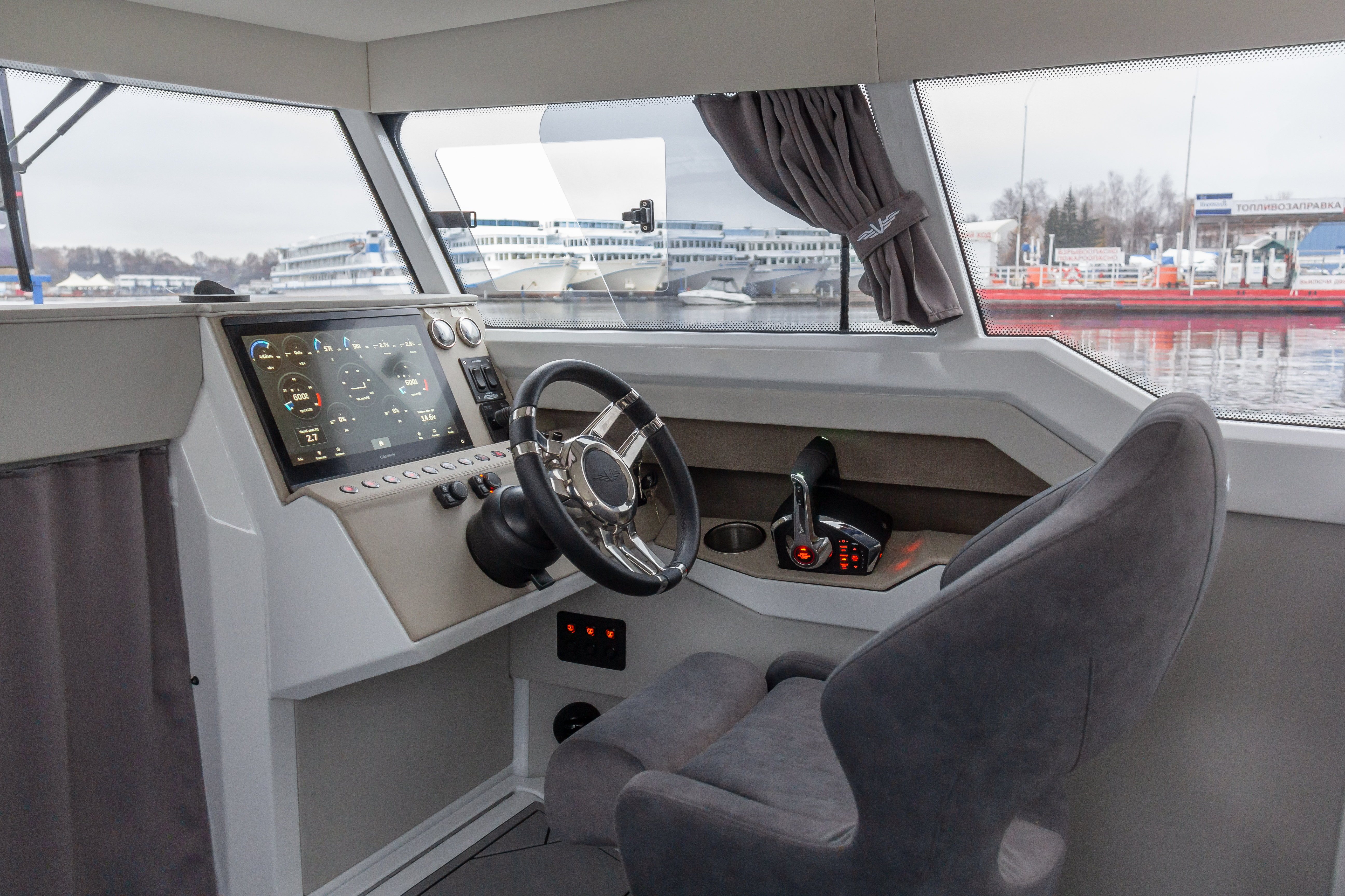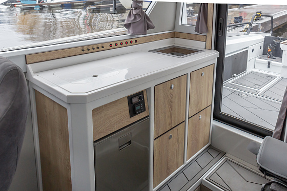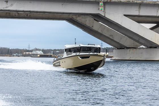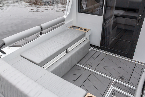 Длина корпуса почти 9 метров, ширина — около 2,5 м, пассажировместимость — до 8 человек. Просторная палуба, трансформируемые сиденья, кормовые площадки и отличное освещение создают ощущение дома на воде. Всё продумано — от компоновки до мелочей.