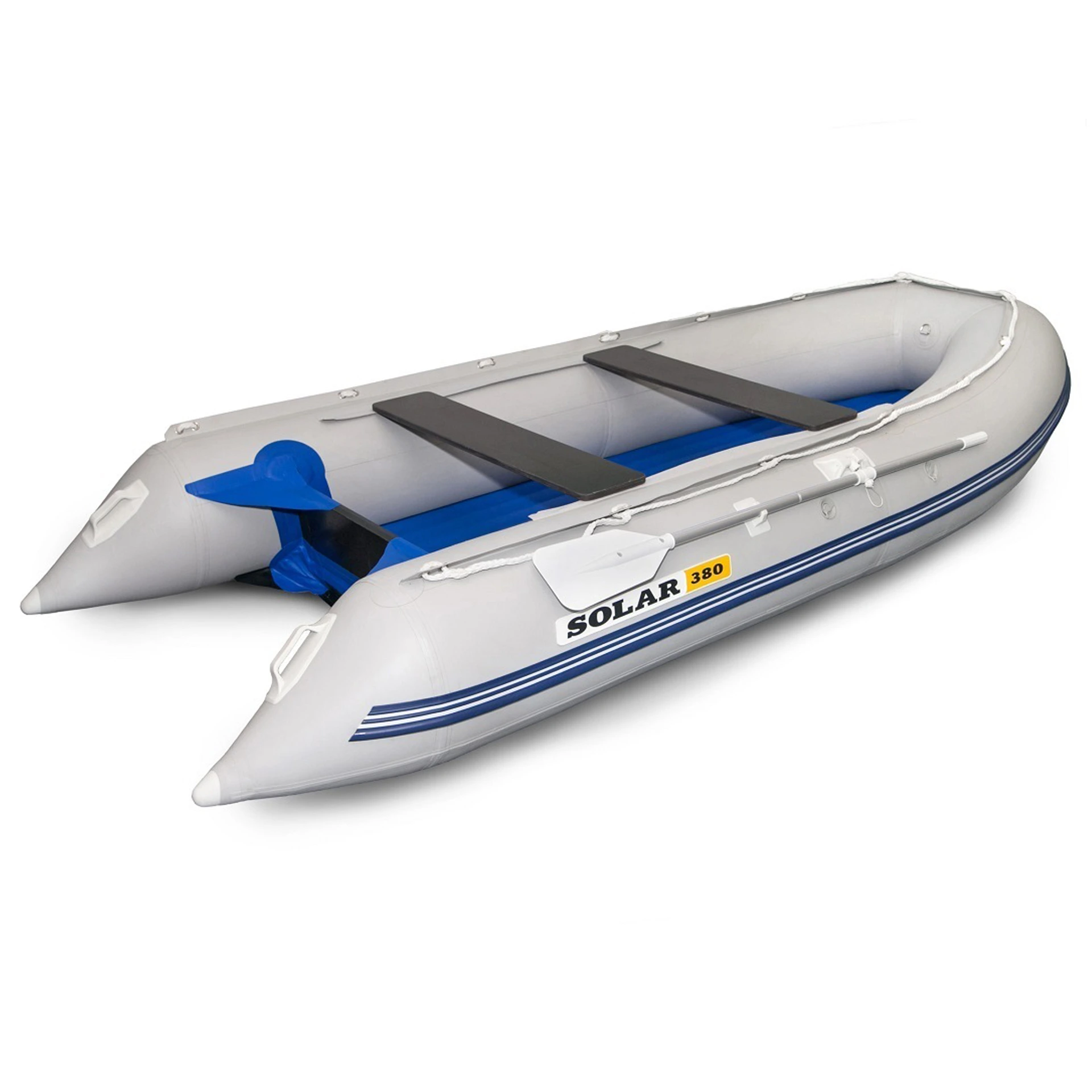 Килевые лодки SOLAR 380 «Максима» предназначена для безаварийной эксплуатации в суровых условиях. Надувное дно низкого давления выполненное из двух слоев ПВХ не боится коряжника, камней и зарослей камыша, а верхний слой ПВХ на палубе имеет рифленое нескользящее покрытие. Дополнительно дно лодки может быть усилено полиуретановой пленкой или ПВХ тканью(опция)