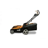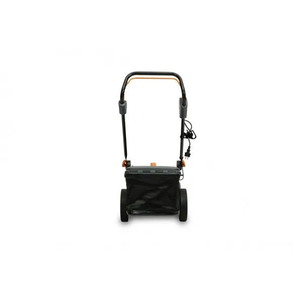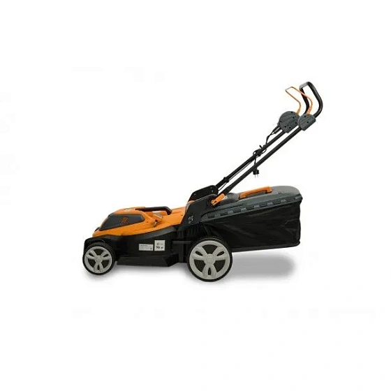 Травосборник объемом 50 л изготовлен из комбинированных материалов (текстиль и пластик), что делает его легким, удобным в установке и очистке. Индикатор заполнения отсутствует, но большой объем позволяет работать продолжительное время без остановок. Колеса увеличенного размера на подшипниках обеспечивают плавность и легкость хода, а складная рукоятка упрощает хранение и транспортировку.