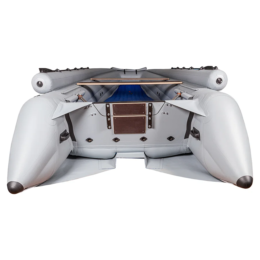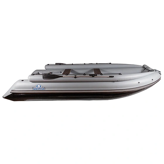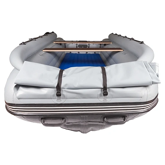 Познакомьтесь с уникальным предложением для ценителей активного отдыха - лодкой ПВХ Выдра Шерпа Эверест 500 Jet в сером цвете. Эта модель создана специально для охоты и рыбалки в российских условиях. Ее ключевая особенность - инновационный плоский вертикальный борт переменного сечения. Благодаря этой технологии при компактных габаритах был создан просторный кокпит шириной 106 см и высотой 44 см. При этом ширина смачиваемой части корпуса осталась минимальной, что наделяет лодку высокой грузоподъемностью, характерной для более узких моделей.