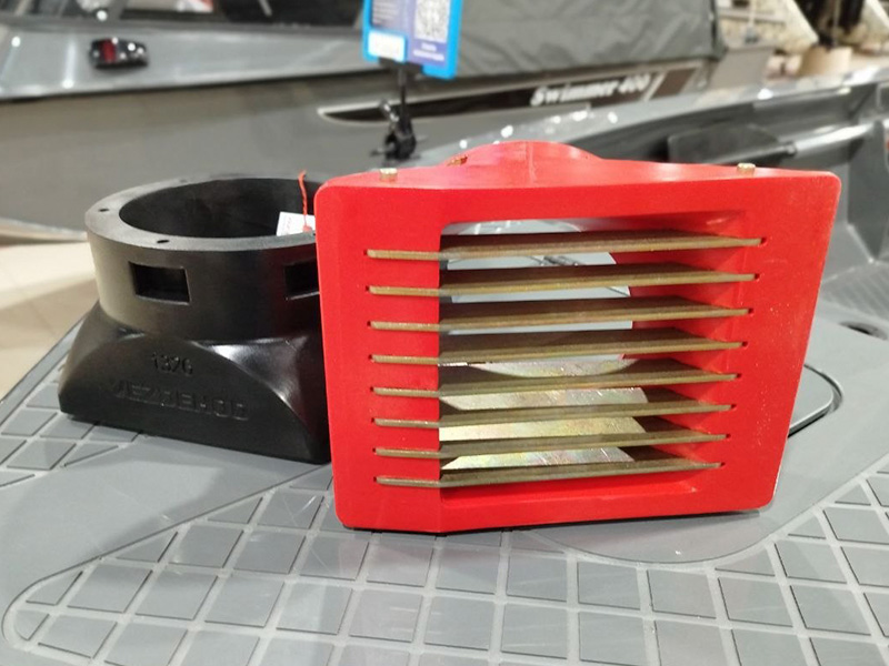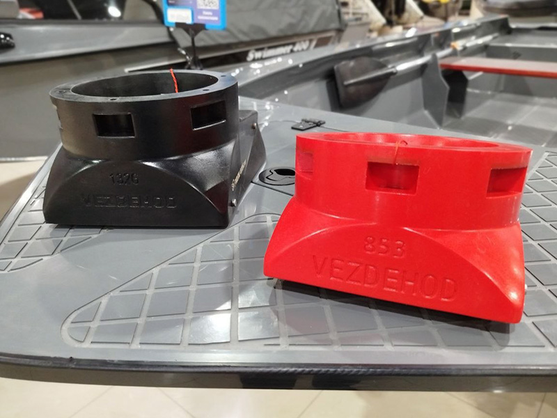 Особого внимания заслуживает обновленная версия полиуретанового водозаборника большой серии VEZDEHOD 1332. Его измененная геометрия повышает проходимость судна примерно на 1 см. Более тонкий и округлый носовой профиль позволяет установить мотор на 0,5 см выше, аналогично увеличению клиренса внедорожника. Расширенная водозаборная зона с десятью пластинами улучшает работу на мелководье и в условиях горных рек, надежно фильтруя даже мелкий мусор.
